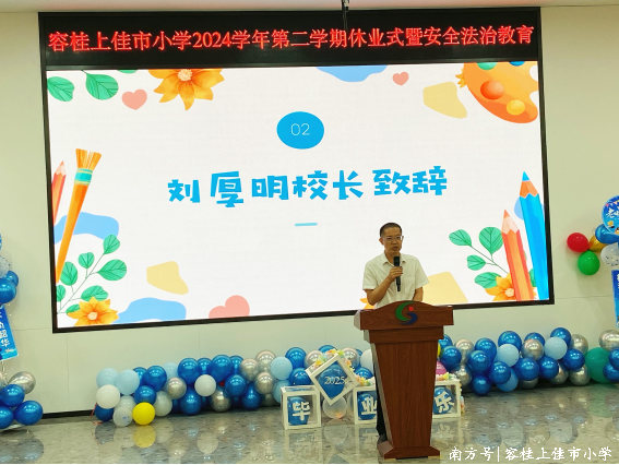 随后由我校刘厚明校长讲话,他全面回顾了本学期学校在教学、德育、校园活动等方面取得的成果,肯定了全体师生的辛勤付出与进步,并对表现优异的学生和班级进行了表彰。“每一份成绩的背后,都是坚持与奋斗的印记。”校长鼓励同学们在假期中继续保持学习热情,劳逸结合,为下一阶段的成长积蓄力量。